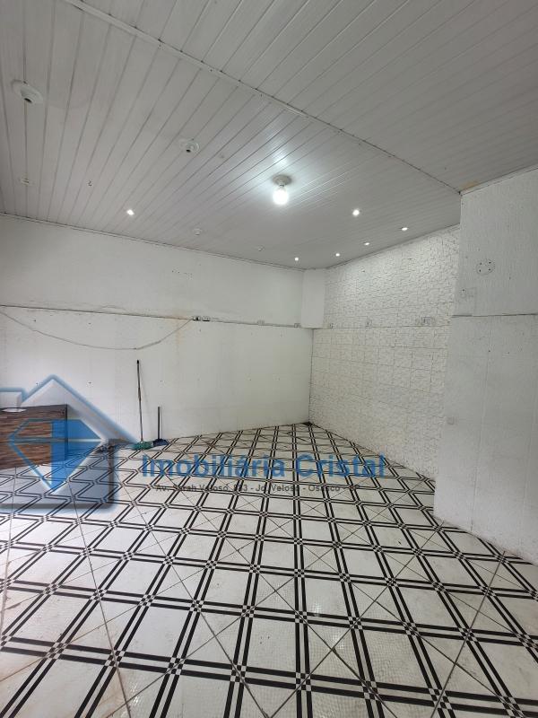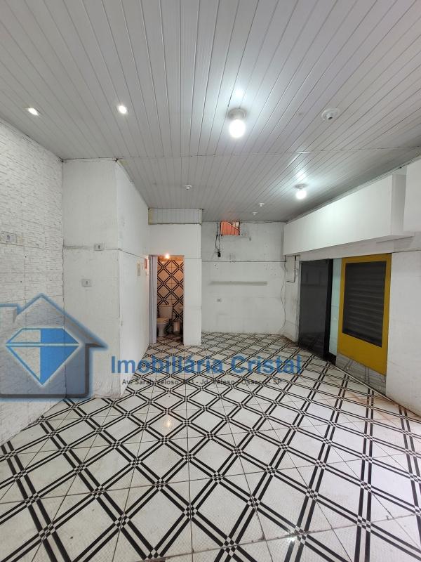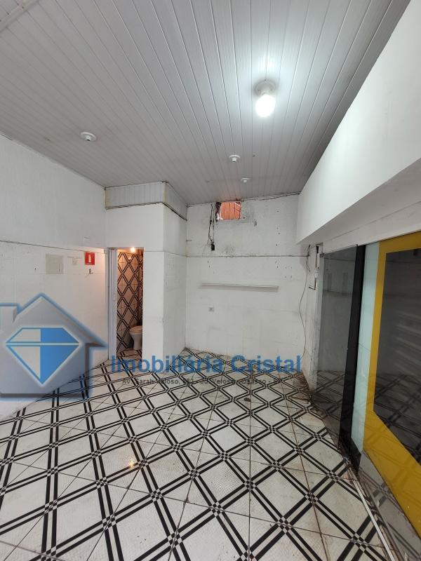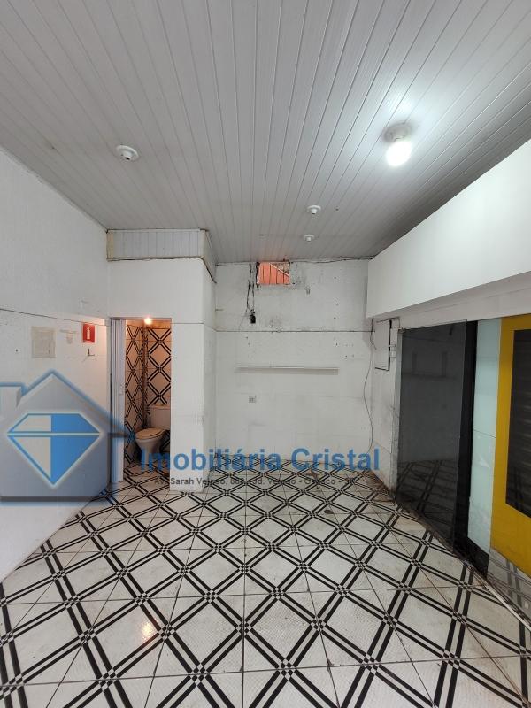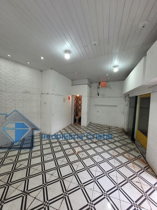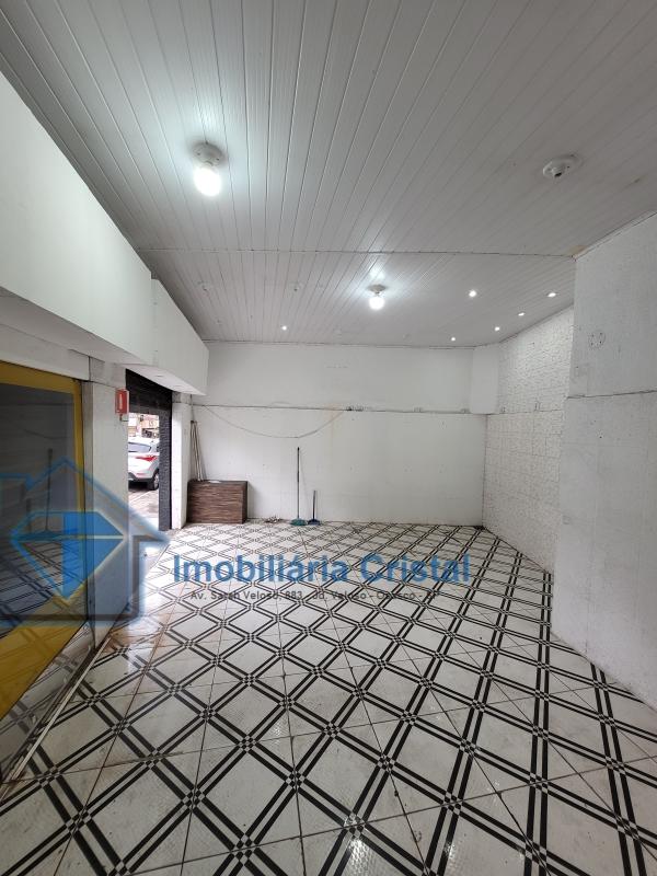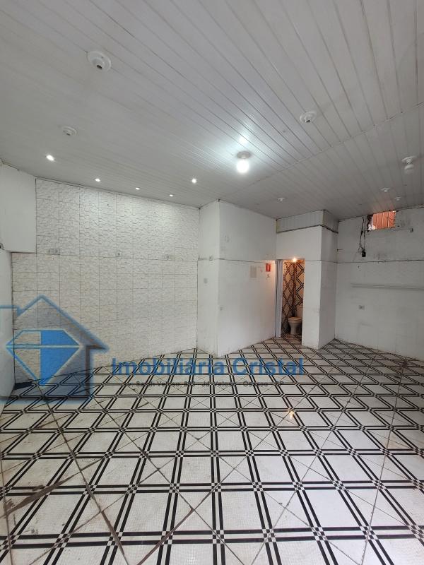Salão térreo comercial de aproximadamente 40 m², com 01 banheiro, uma porta de aço e uma porta de vidro.